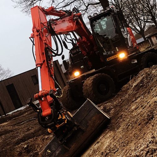 B. Van der Weerd Grondwerken & Transport beschikt over een Hitachi 140 voor het grote grondwerk. In de handen van B. Van der Weerd is kan deze grote en krachtige mobiele graafmachine van 17,5 ton iedere opdracht aan. Wij rusten de machine uit met het juiste hulpstuk –een brede bak, een smalle bak, lepels of een puinbak– daarmee maken we voor iedere situatie de beste samenstelling. Voor aan- en afvoer van grond en zand in het werk, maken we gebruik van een trekker en een kipper.